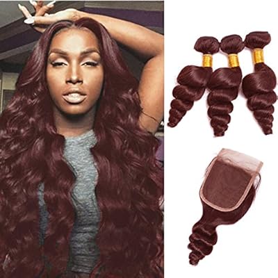 99j Burgundy Loose Deep Wave Human Hair Wefts 3 Bundles With 4x4 Lace Closure Brazilian Hair Extentions Red Wine Color Free Part 4x4 Hand Tied Lace